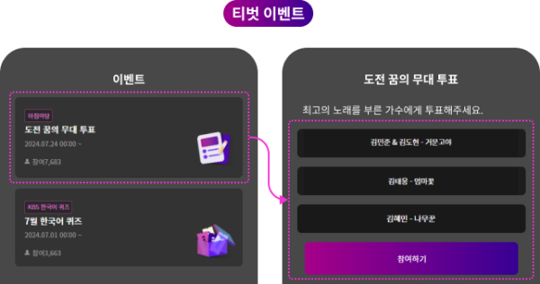 티벗 앱을 설치하고 네이버, 카카오 계정 등으로 로그인이 가능하며 간단한 회원정보를 입력하면 됩니다. 티벗 앱 로그인이 끝나면 아침마당 페이지로 들어와서 아침마당 도전 꿈의 무대 투표 이벤트 배너를 누릅니다.