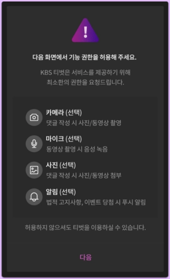'다음 화면에서 기능 권한을 허용해 주세요'라는 창이 나옵니다. 모두 선택 사항으로 허용하지 않아도 티벗을 이용하실 수 있습니다. 다음을 눌러 주세요.