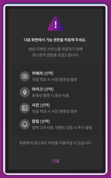 - 처음 실행 시, 카메라, 마이크, 사진, 알림 등의 기능 권한을 허용하라는 메시지가 나타납니다. 필요에 따라 권한을 허용합니다.